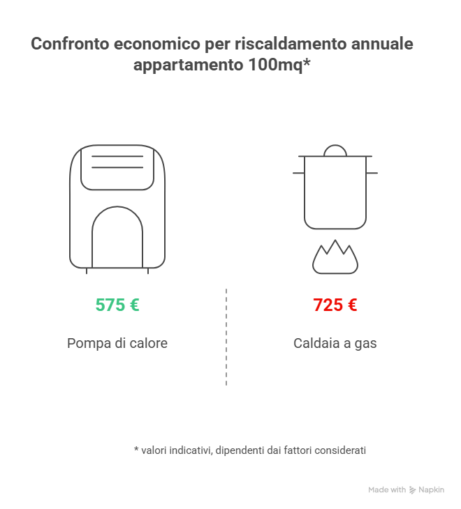 Per fare un confronto diretto, si dovrebbe confrontare il costo di installazione di una pompa di calore con un climatizzatore per ogni ambiente. In un appartamento con 5 o 6 ambienti serviti (ad esempio cucina, soggiorno, due camere da letto e servizi) il costo di acquisto e installazione dei climatizzatori necessari potrebbe facilmente pareggiare quello di una pompa di calore.
